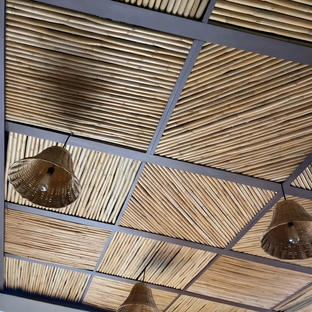 This ceiling system delivers visible natural bamboo texture with structural clarity, creating depth and warmth without conventional gypsum finishes.