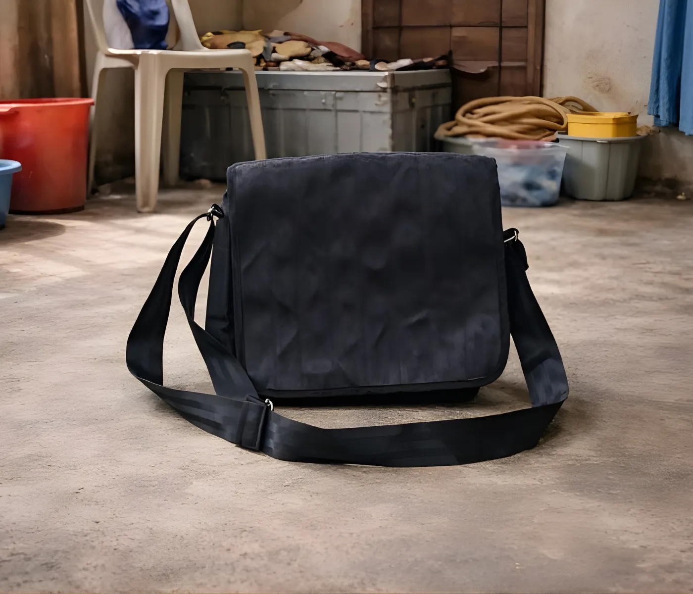 Crafted from upcycled car seat belts, this laptop bag is a statement in durability, design, and sustainability. Each piece is handmade by trained artisans under Bamboo House India’s livelihood programs — transforming industrial waste into functional, eco-conscious fashion.